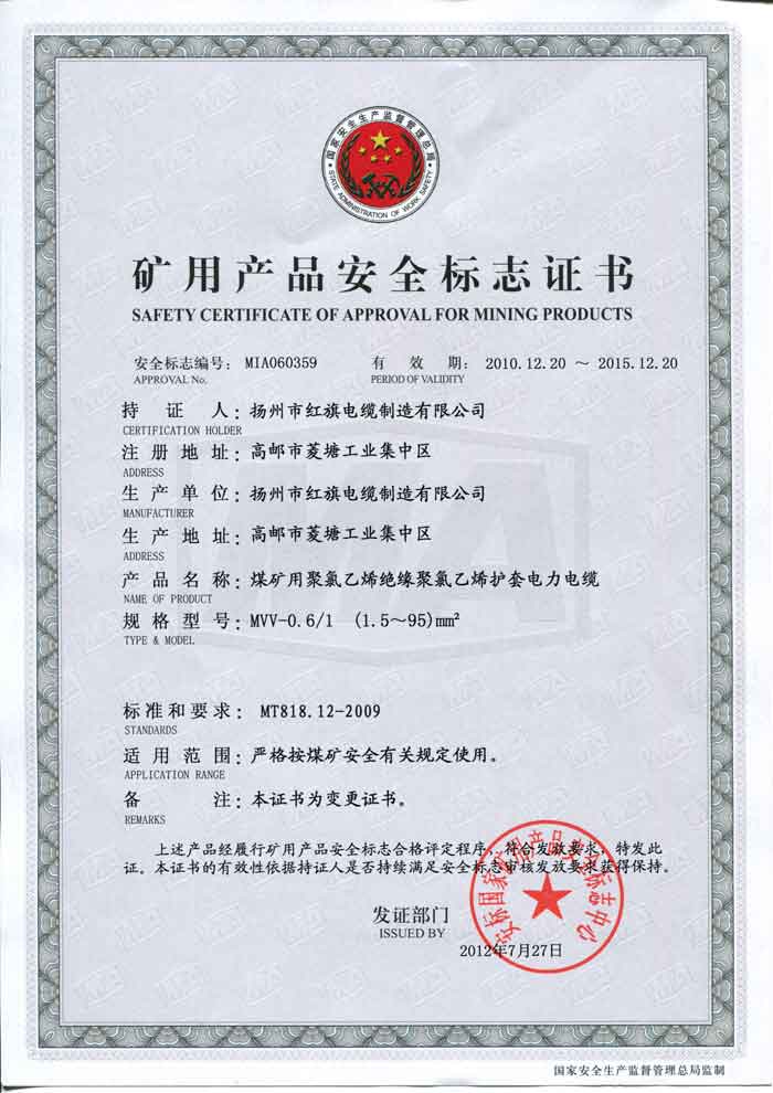 煤礦礦用產(chǎn)品安全標志證書-MVV