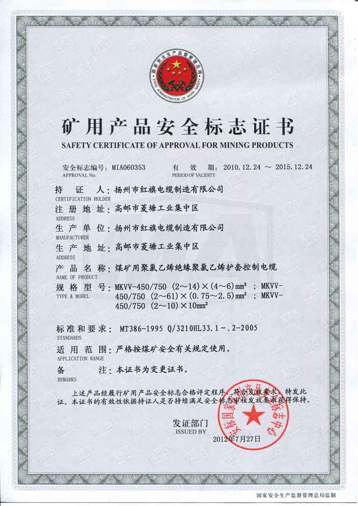 煤礦礦用產(chǎn)品安全標(biāo)志證書-MKVV
